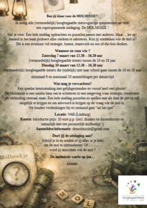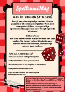 Speelmiddag voor (vermoedelijk) hoogbegaafde kinderen tot ongeveer 12 jaar. Er wordt onder andere bewogen en geklommen op twee parcours (in de gymzaal en buiten).