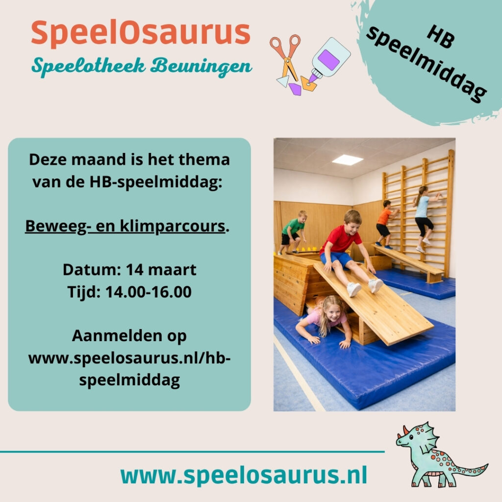 De HB-speelmiddag van de SpeelOsaurus is voor (vermoedelijk) hoogbegaafde kinderen een leuke gelegenheid om met peers in contact te komen. Deze keer is het thema: klim- en beweegparcours. Zowel binnen in de gymzaal als buiten (bij droog weer) zetten we een parcours uit waarbij geklommen, gesprongen, gekropen en gerend moet worden.